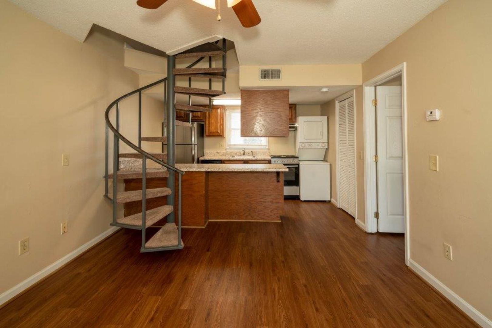 Campus Courtyard at Glenn is a two bedroom two bath unit that is located one block from the Auburn University campus. This is an upper floor unfurnished unit. The living room and kitchen feature an open floor plan. The kitchen has a breakfast bar with plenty of counter space and storage. The first bedroom is located off the living room and has a full bath and walk in closet. The second bedroom is located up the spiral staircase from the living room. The area is huge and has unique architectural details to give it a loft-like feel. There is also a walk in closet and full bath.