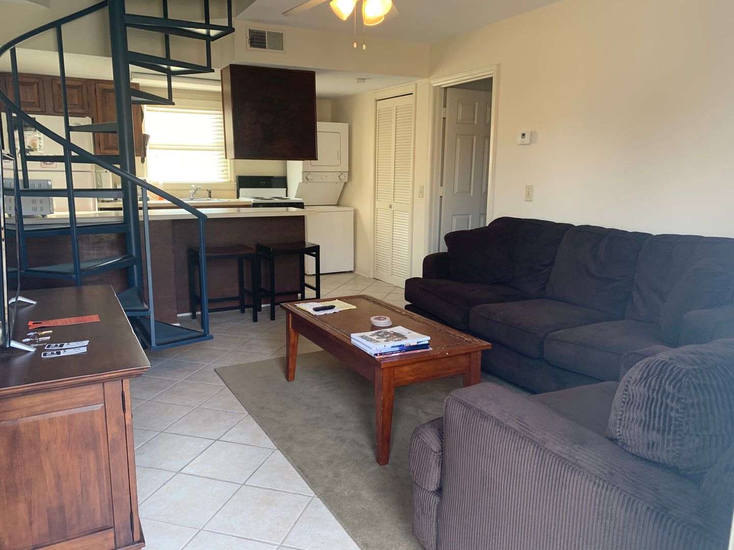 Campus Courtyard at Glenn is a two bedroom two bath unit that is located one block from the Auburn University campus. This is an upper floor unfurnished unit. The living room and kitchen feature an open floor plan. The kitchen has a breakfast bar with plenty of counter space and storage. The first bedroom is located off the living room and has a full bath and walk in closet. The second bedroom is located up the spiral staircase from the living room. The area is huge and has unique architectural details to give it a loft-like feel. There is also a walk in closet and full bath. This complex offers very close access to Auburn’s engineering and business buildings.