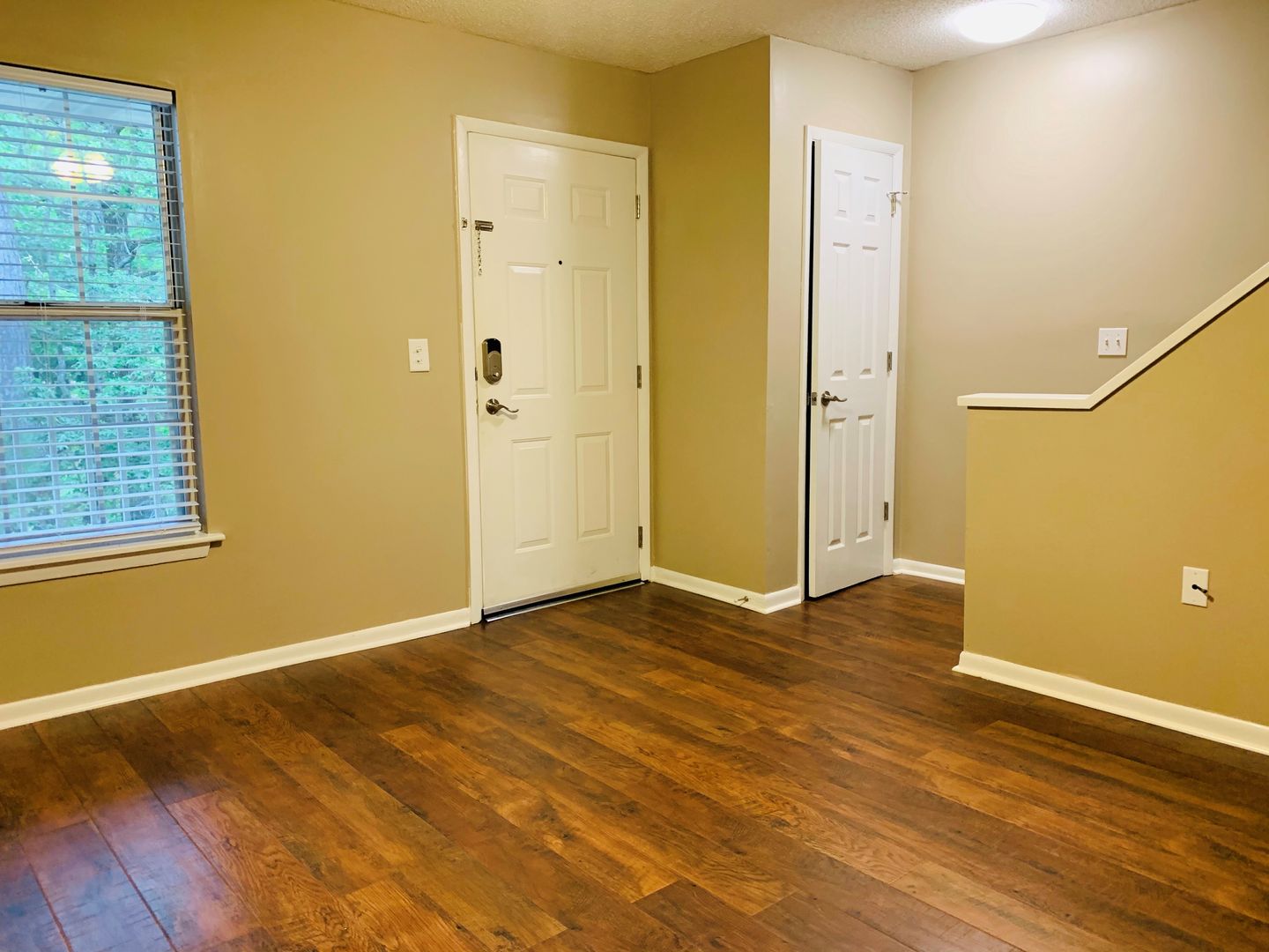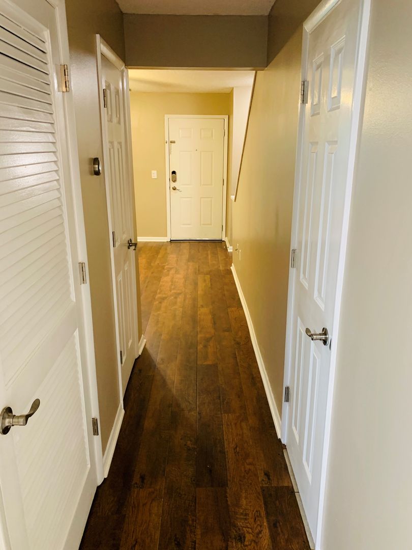 This is an unfurnished, pet friendly, 1,152 square foot, two bedroom, two and a half bathroom unit, located on the second floor. It has hardwood-like flooring in the living room and bedrooms. The kitchen includes a refrigerator, stove/oven and dishwasher. The unit also includes a full size washer and dryer. This is a two story floor plan with a communal balcony on the third floor.