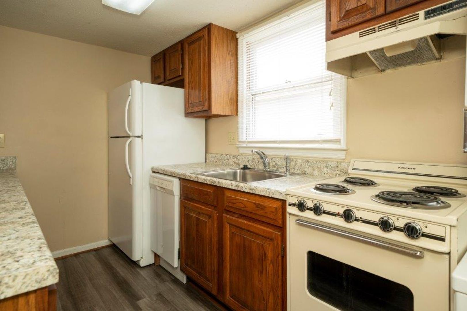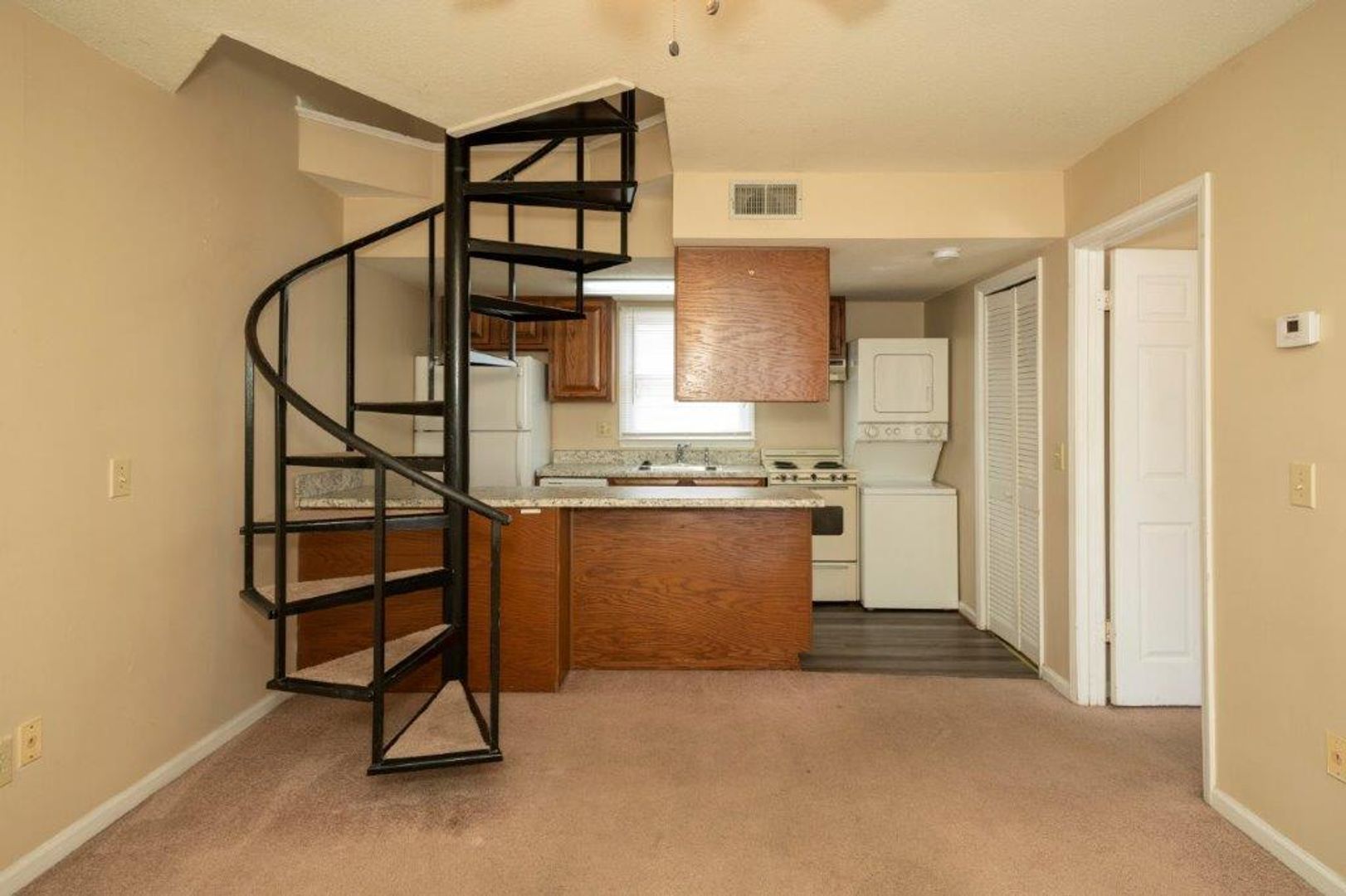 Campus Courtyard at Glenn is a two bedroom two bath unit that is located one block from the Auburn University campus. This is an upper floor unfurnished unit. The living room and kitchen feature an open floor plan. The kitchen has a breakfast bar with plenty of counter space and storage. The first bedroom is located off the living room and has a full bath and walk in closet. The second bedroom is located up the spiral staircase from the living room. The area is huge and has unique architectural details to give it a loft-like feel. There is also a walk in closet and full bath. This unit is not pet friendly.