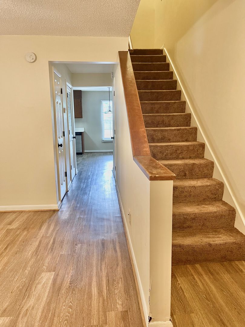 This is an unfurnished, non-pet, 1,152 square foot, two bedroom, two and a half bathroom unit, located on the second floor. It has wood-like flooring in the common areas and carpet in the bedrooms. The kitchen includes a refrigerator, stove/oven, and dishwasher. The unit also includes a full size washer and dryer. This is a two story floor plan with a communal balcony on the third floor.